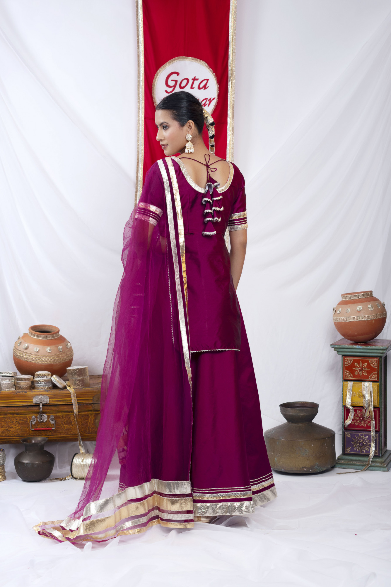 """Top – Tafetta Silk Bottom – Tafetta silk Dupatta– Soft Net with heavy Gota Work (2.25-2.5 meter) Wash Care – Dry Clean Only Pattern – Solid with lace work Detailing Model – Model is wearing S size Model Height – 5*6 Disclaimer – Slight Colour Variation may occur due to different screen display resolution and lighting can also play some role ."""
