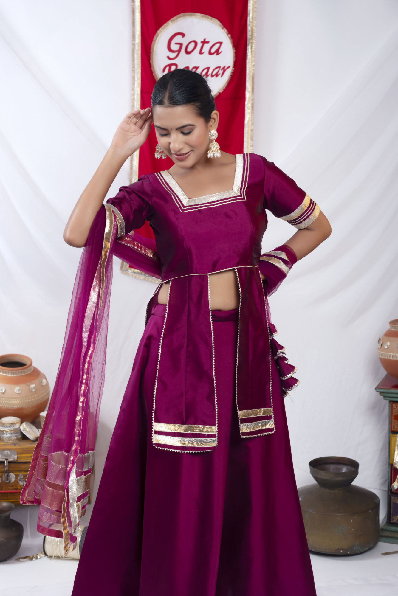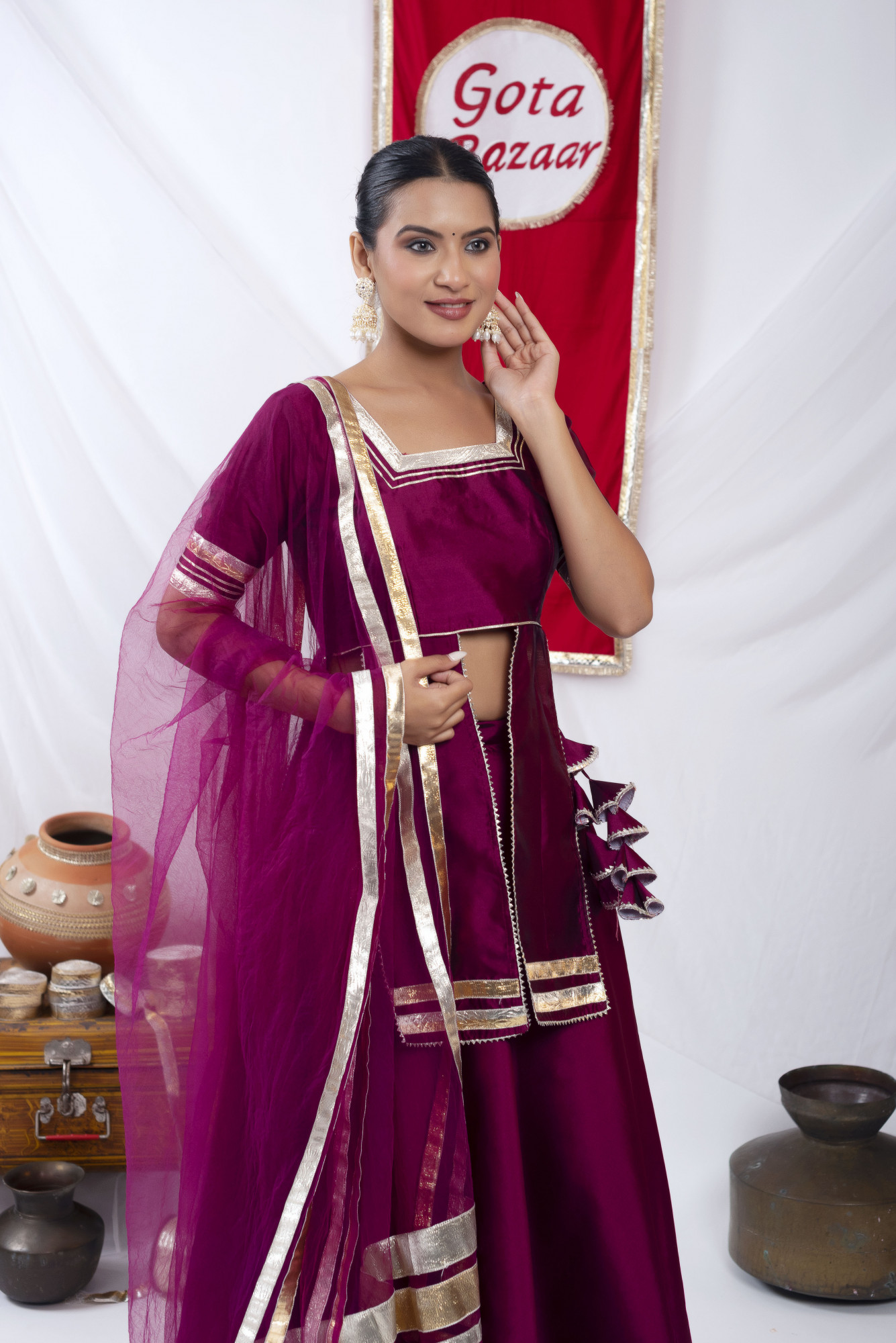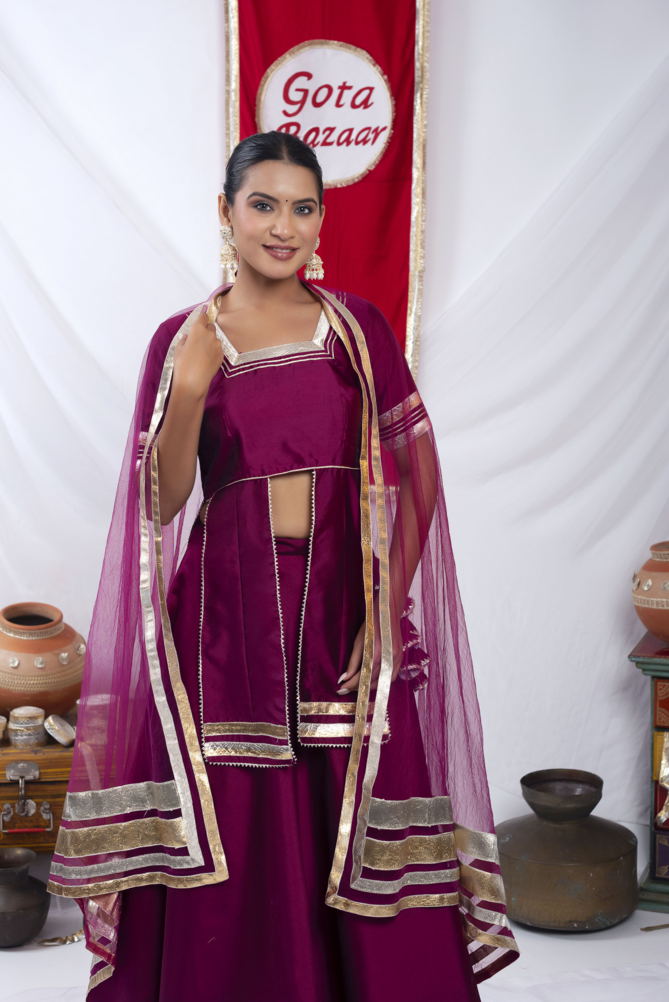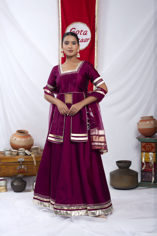 Gota bazaar Wine Tafetta Silk Front Slit Skirt Set