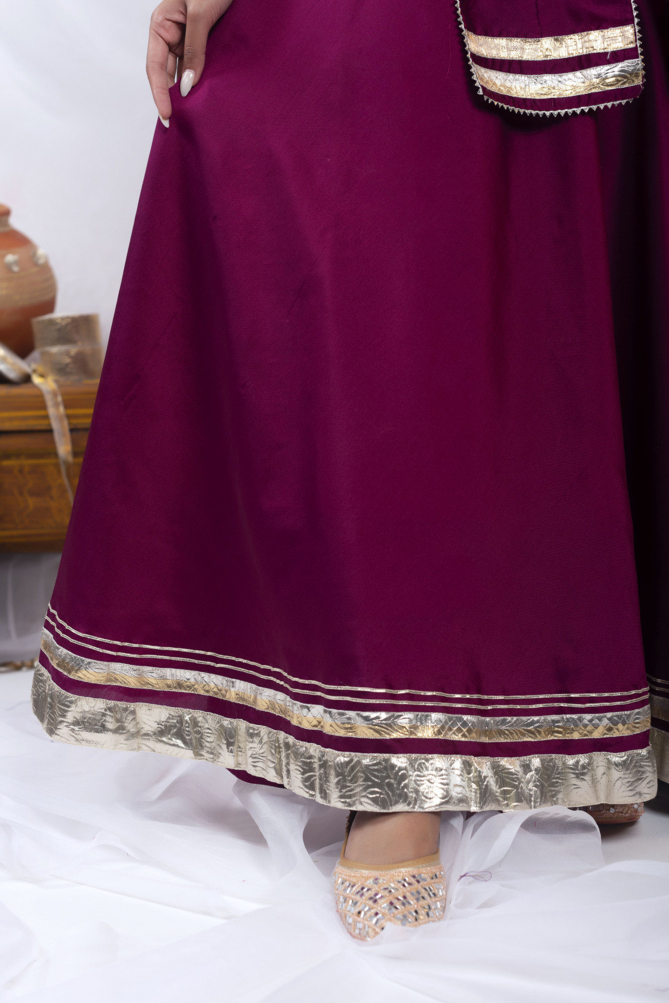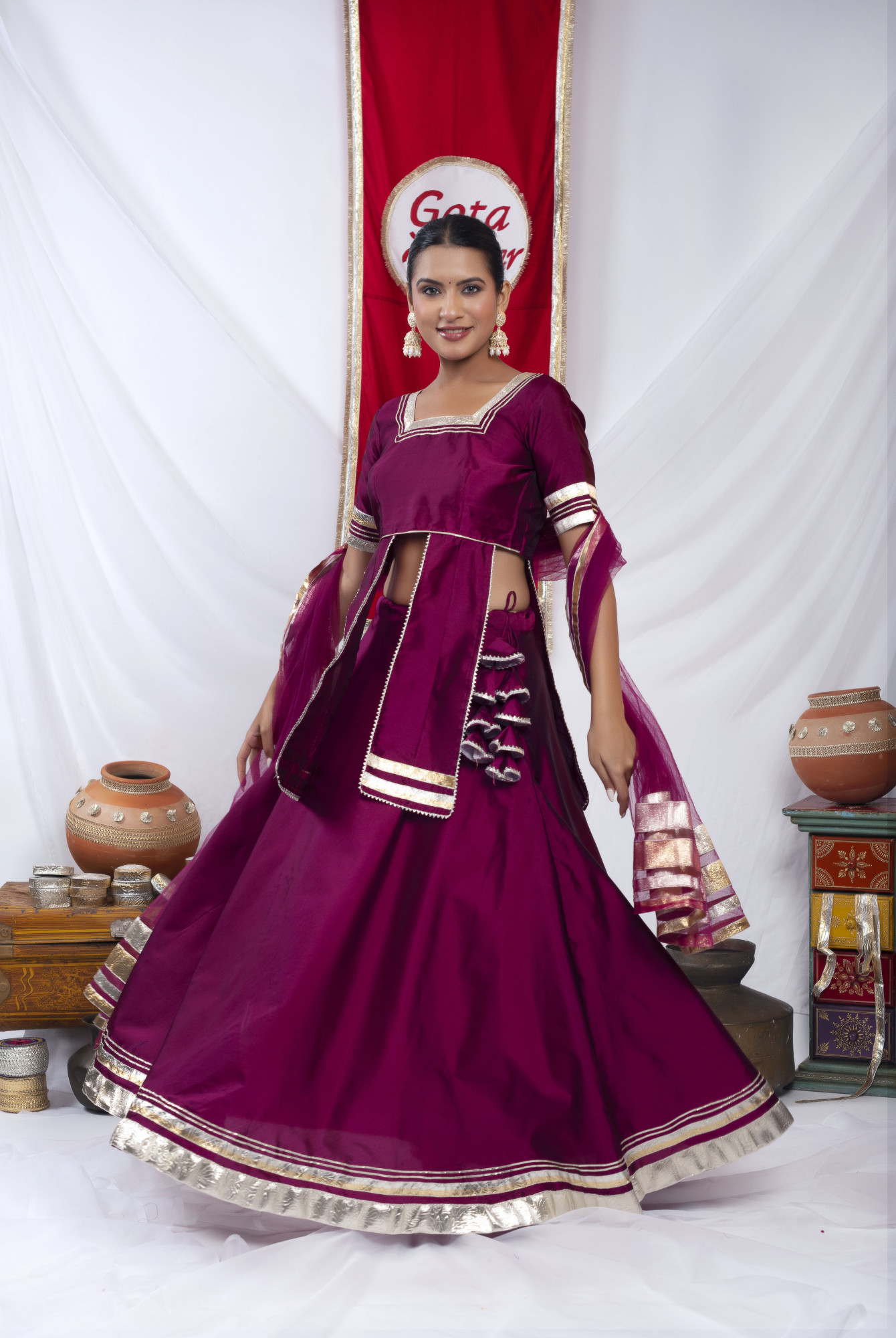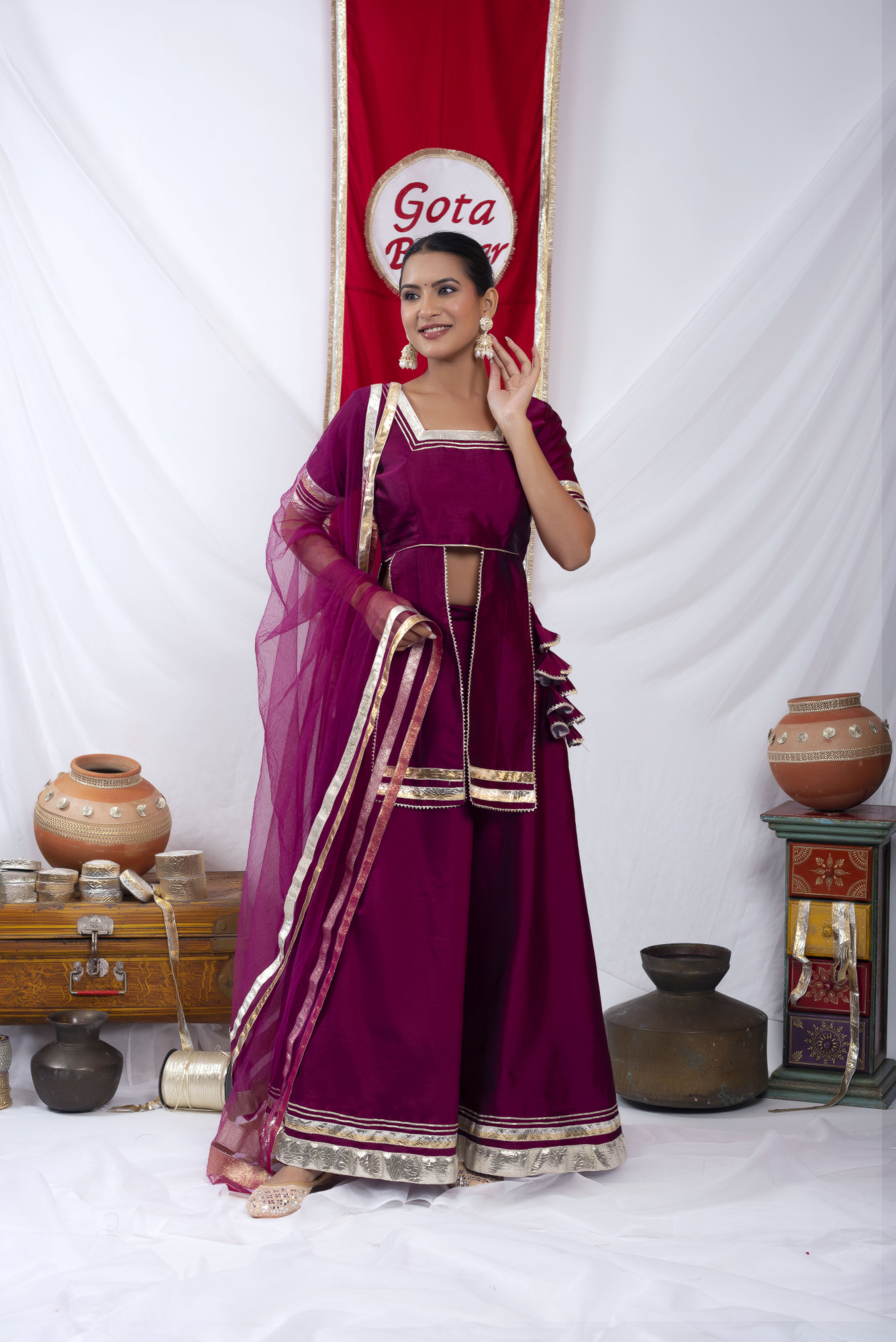 Gota bazaar Wine Tafetta Silk Front Slit Skirt Set