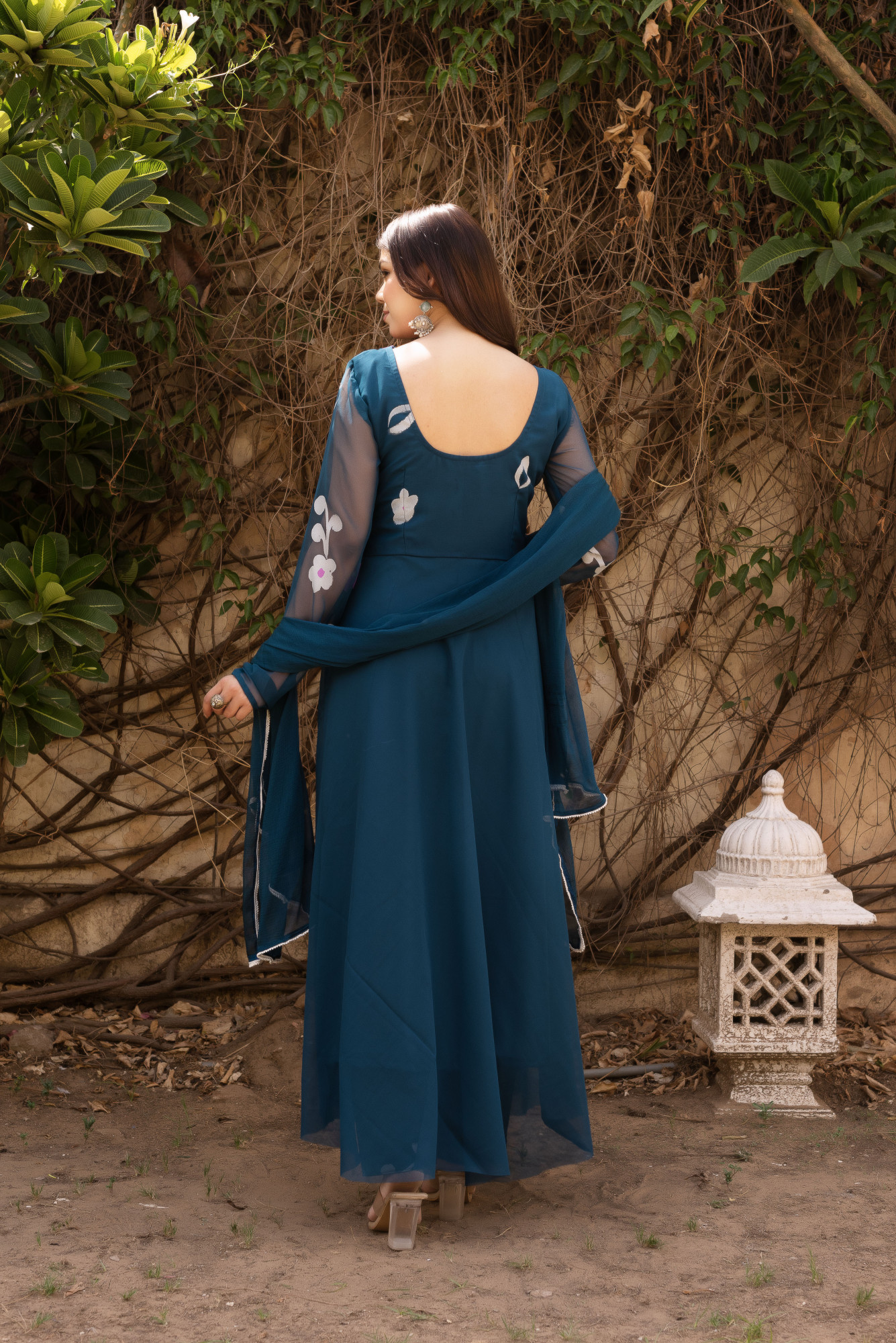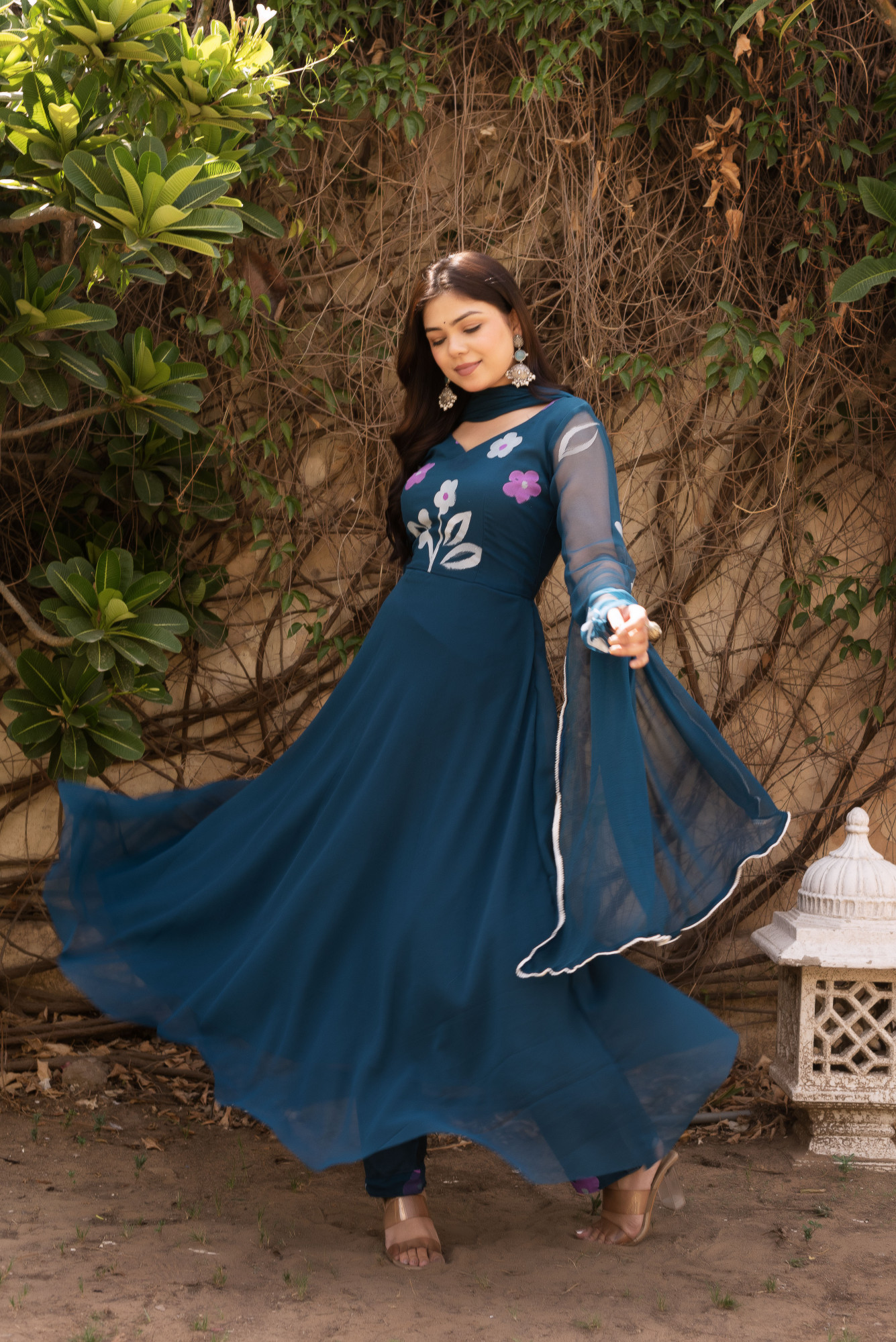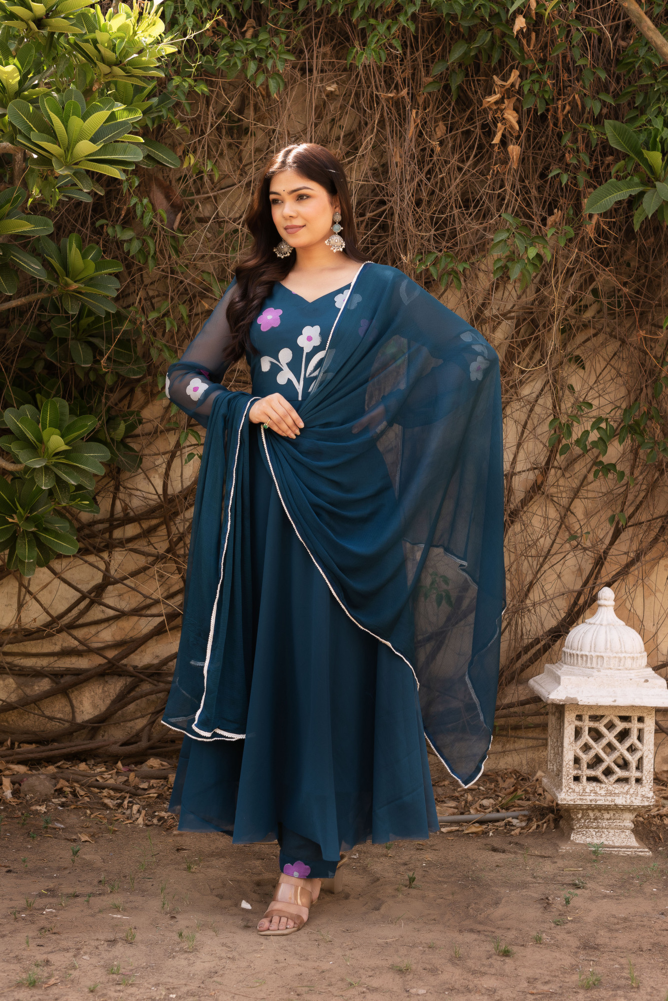 Teal Blue Floral Hand painted Anarkali Set.
