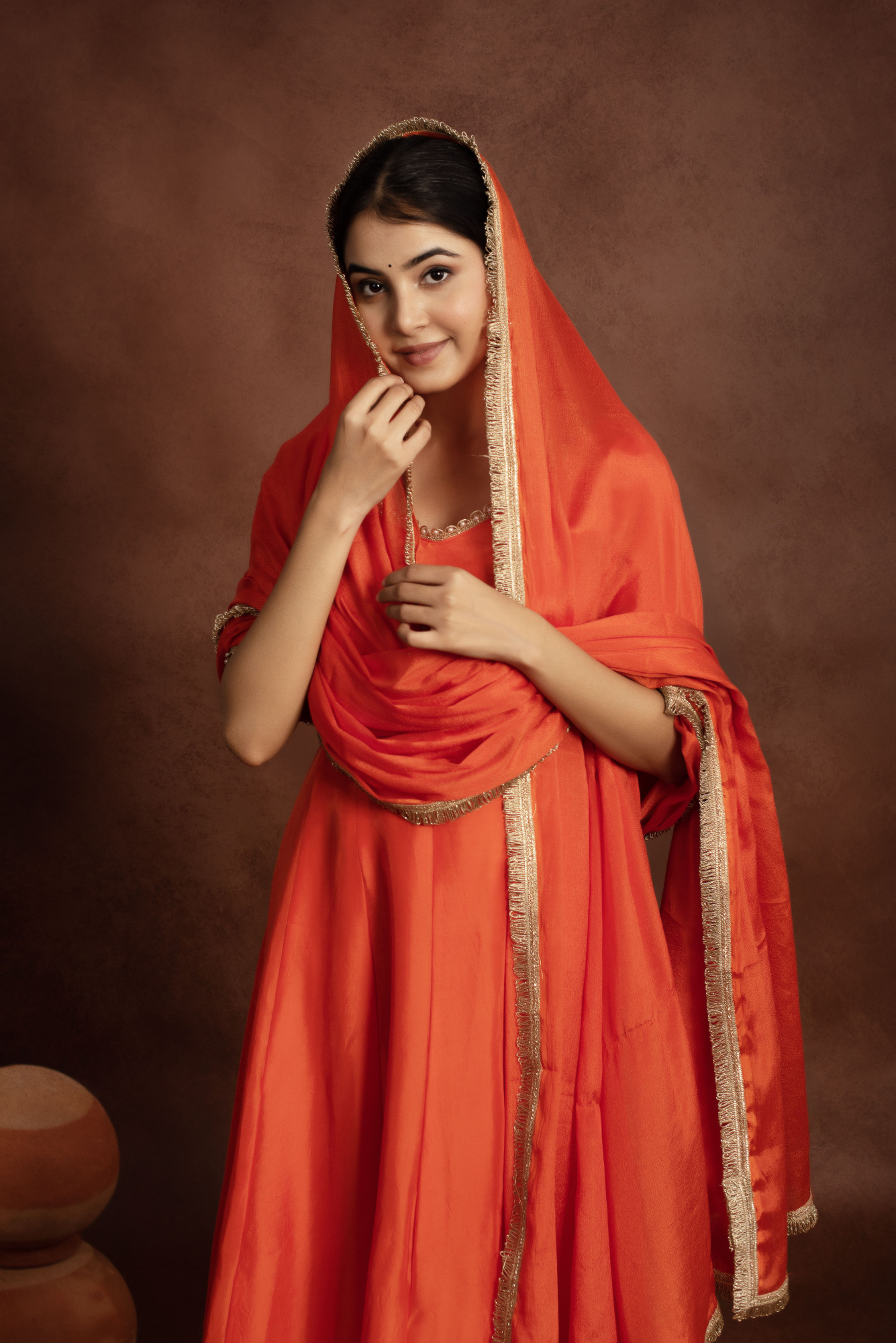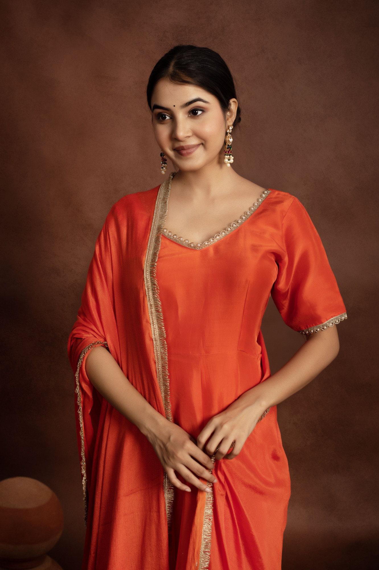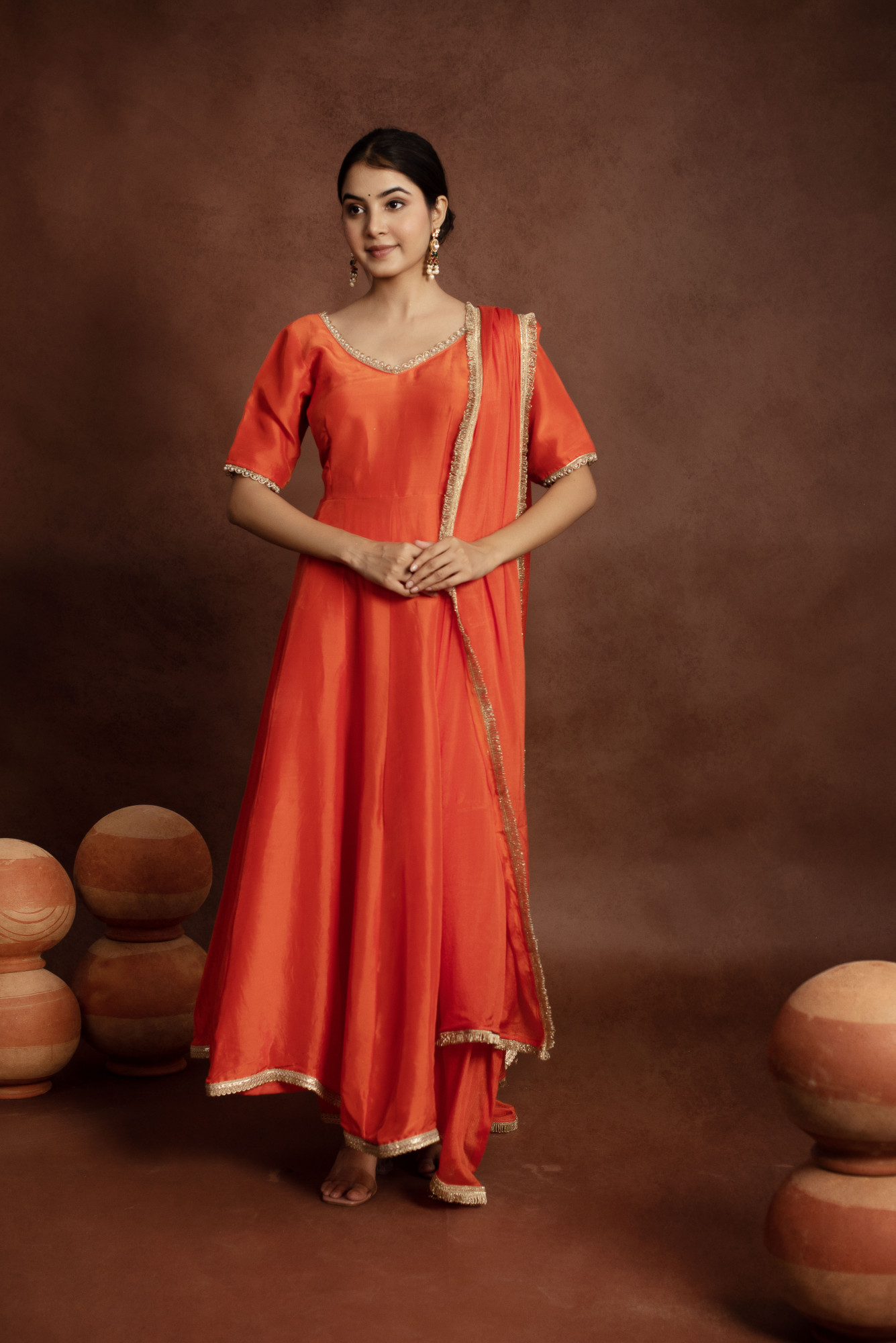 Pure Silk Anarkali with straight pants and chinon dupatta with lace work