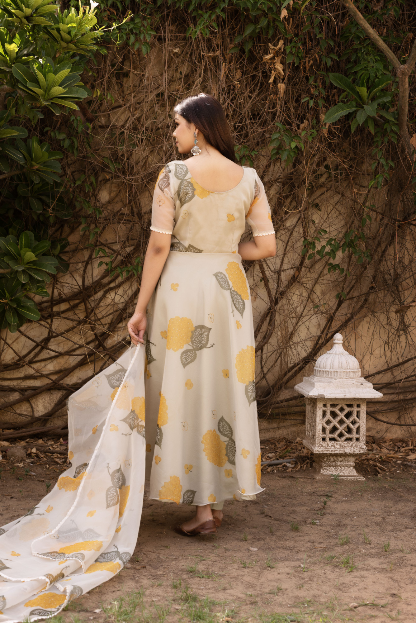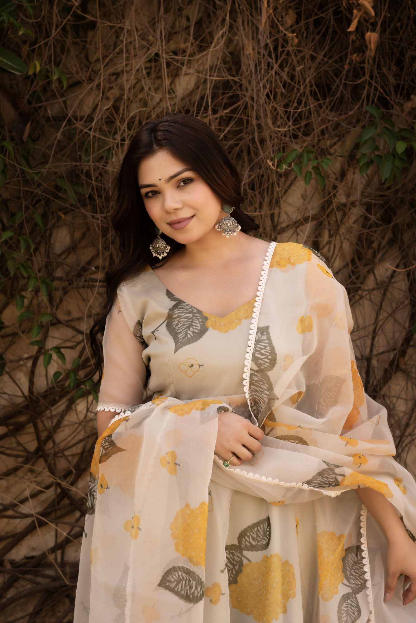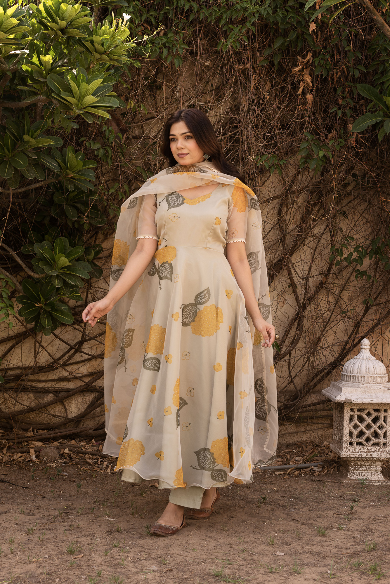Beautiful Printed Floral Anarkali With Straight Cotton Pants and Organza Dupatta with lace work