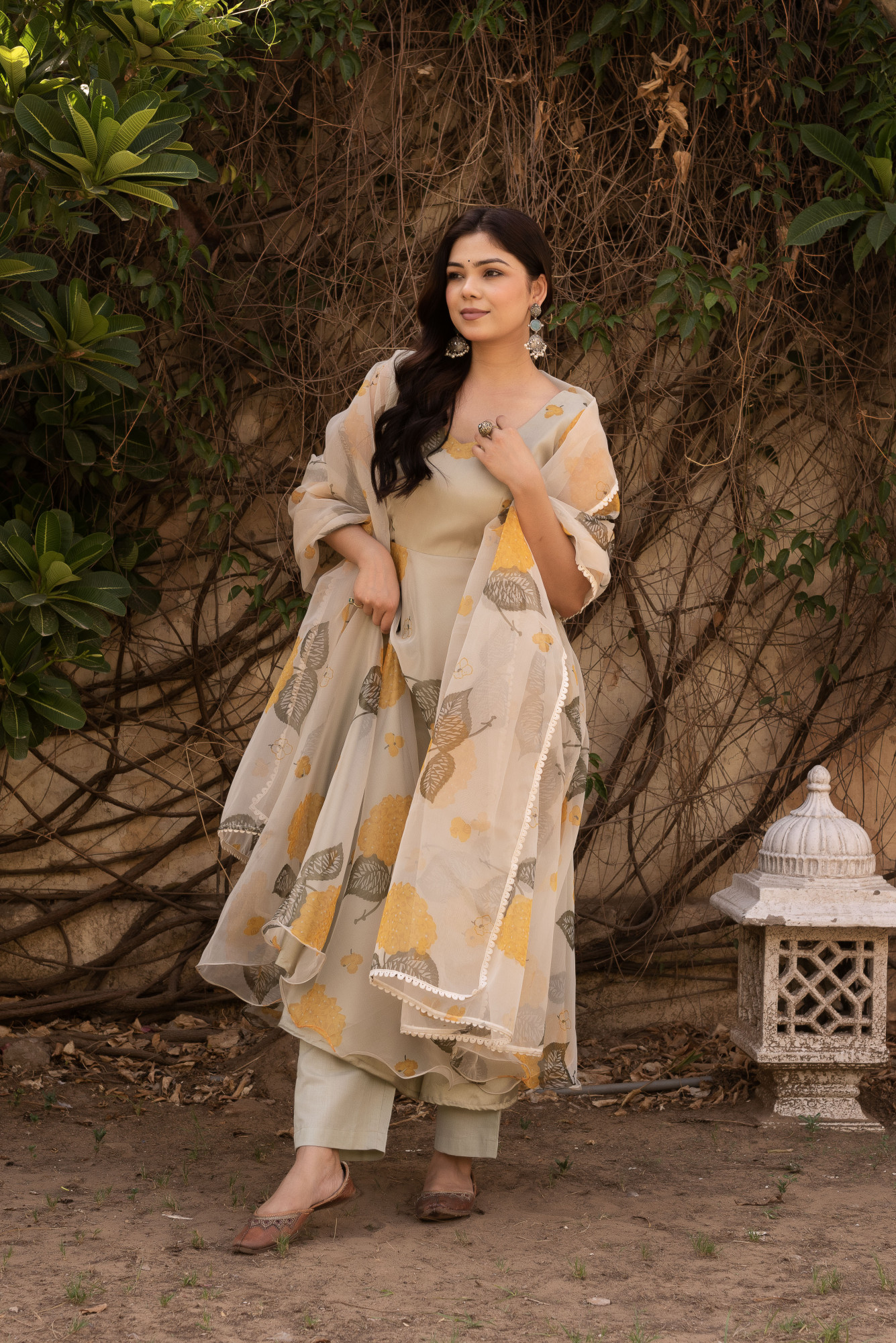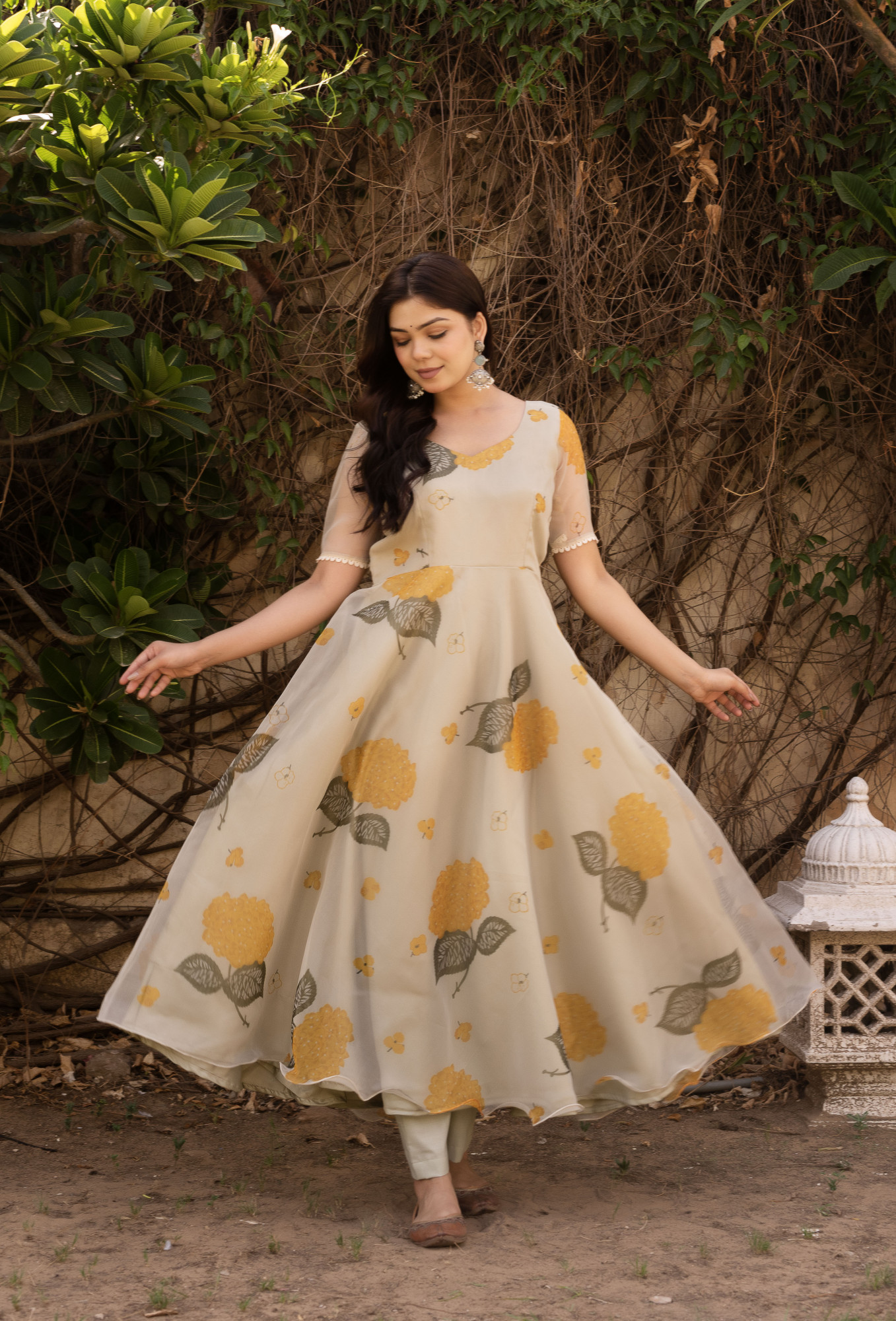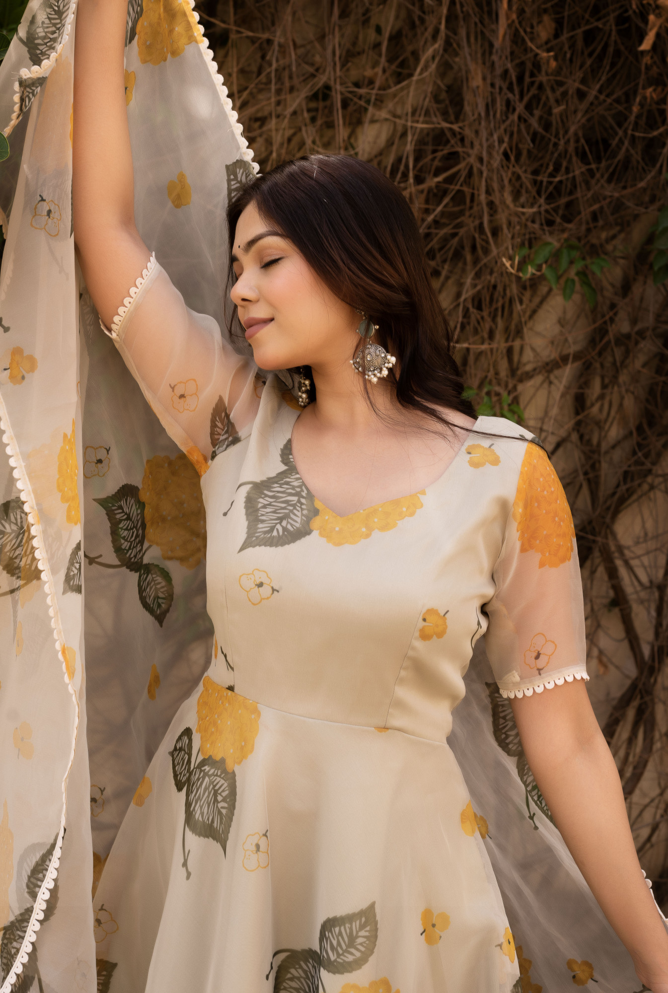 Beautiful Printed Floral Anarkali With Straight Cotton Pants and Organza Dupatta with lace work